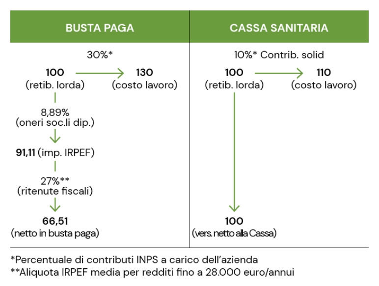Le contribuzioni versate al Fondo Sanitario dall’azienda sono totalmente esenti da tasse e soggette soltanto ad un contributo di solidarietà del 10% all’Inps sull’imponibile versato.